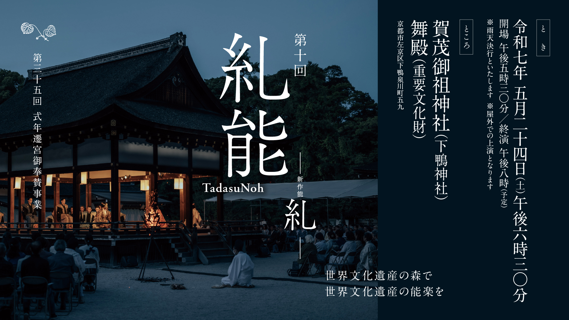 神と人との間の千年のいとなみを振り返り、自然と文化のすがたをもういちど見つめ直したいと考え、本年の「糺能」は第十回を記念し、また1000年の節目へ向けて、新作能『糺』を上演いたします。