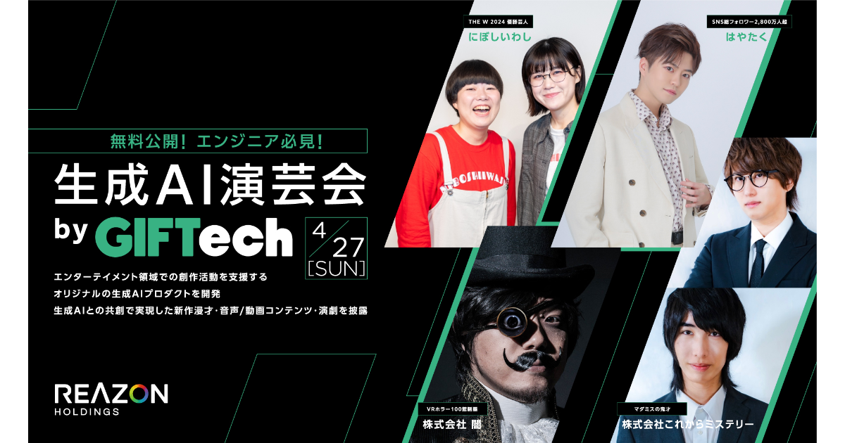 株式会社レアゾン・ホールディングス(本社:東京都新宿区、代表取締役:渡邉 真、以下 レアゾン・ホールディングス)は、エンジニアの創造性を刺激し、モノ創りの喜びを再発見するために発足したプロジェクト『GIFTech』にて企画・運営している、プロの”エンターテイナー”と共にプロダクト開発を行うハッカソン『GIFTech 2025春 – Humanity1.5』の成果発表として、2025年4月27日(日)10:00より「生成AI演芸会」を開催いたします。また、本日より「生成AI演芸会」の観覧者を募集いたします。(観覧料無料)