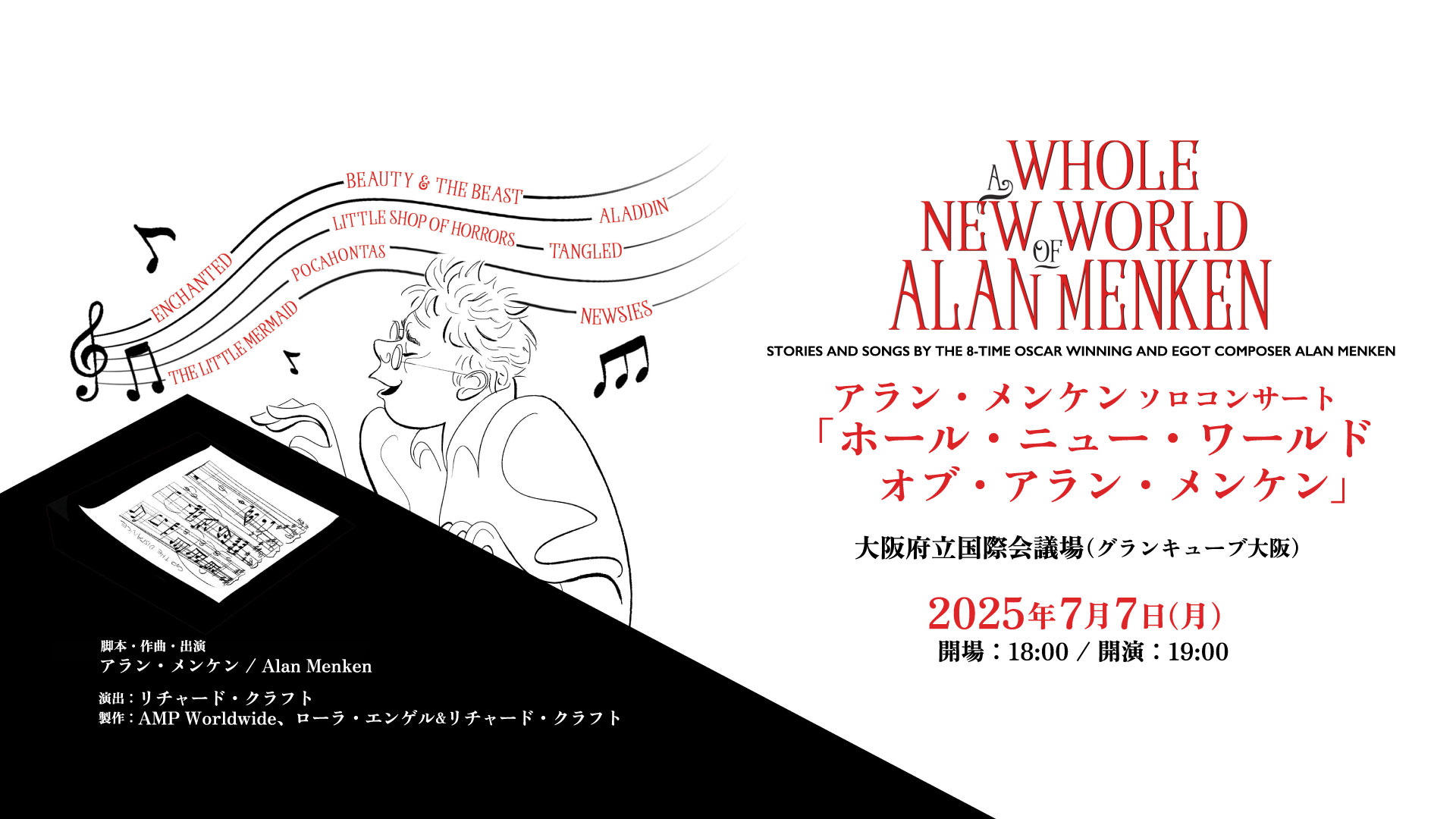 彼自身が脚本と構成を手掛け、ピアノの弾き語りとスクリーンを駆使した贅沢な演出で、彼のパフォーマンスを存分に楽しめることができる待望の公演『アラン・メンケン ソロコンサート「ホール・ニュー・ワールド・オブ・アラン・メンケン」』が七夕の夜(7月7日)に大阪府立国際会議場(グランキューブ大阪)にて、一夜限りで開催する。