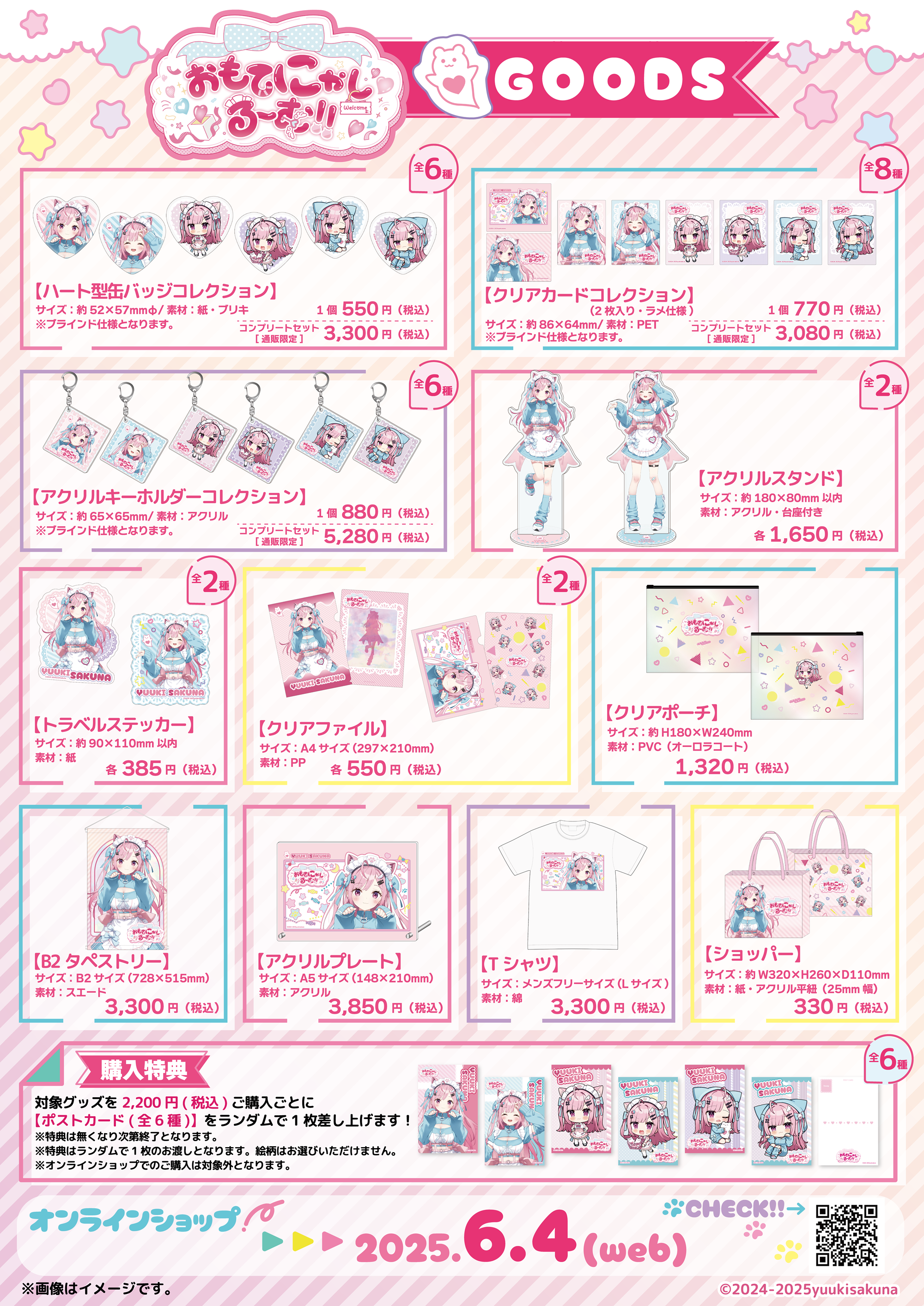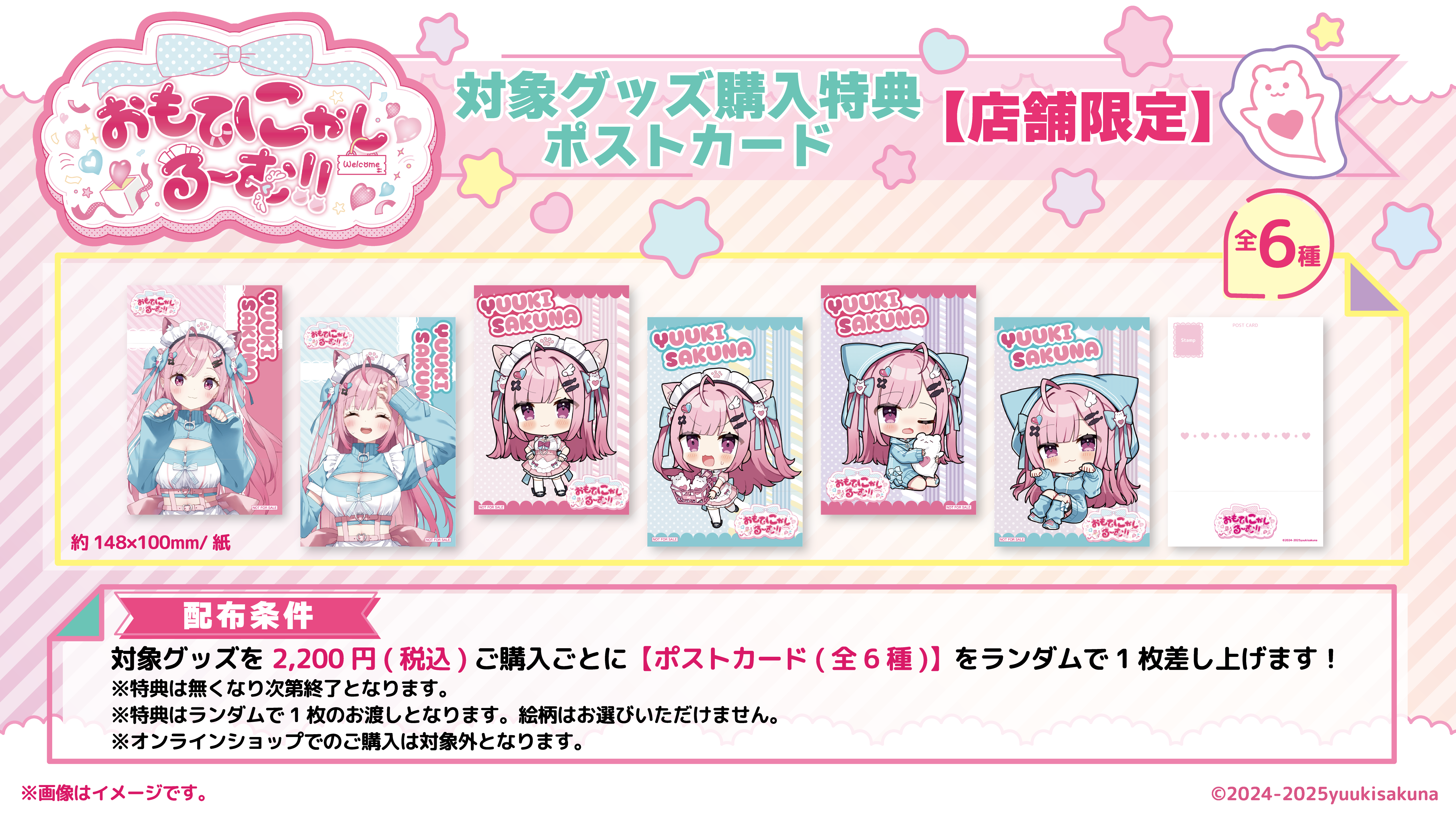 期間中、「結城さくな×おもてにゃしるーむ」グッズ商品をご購入2,200円(税込)毎に【ポストカード(全6種)】をランダムで1枚差し上げます。