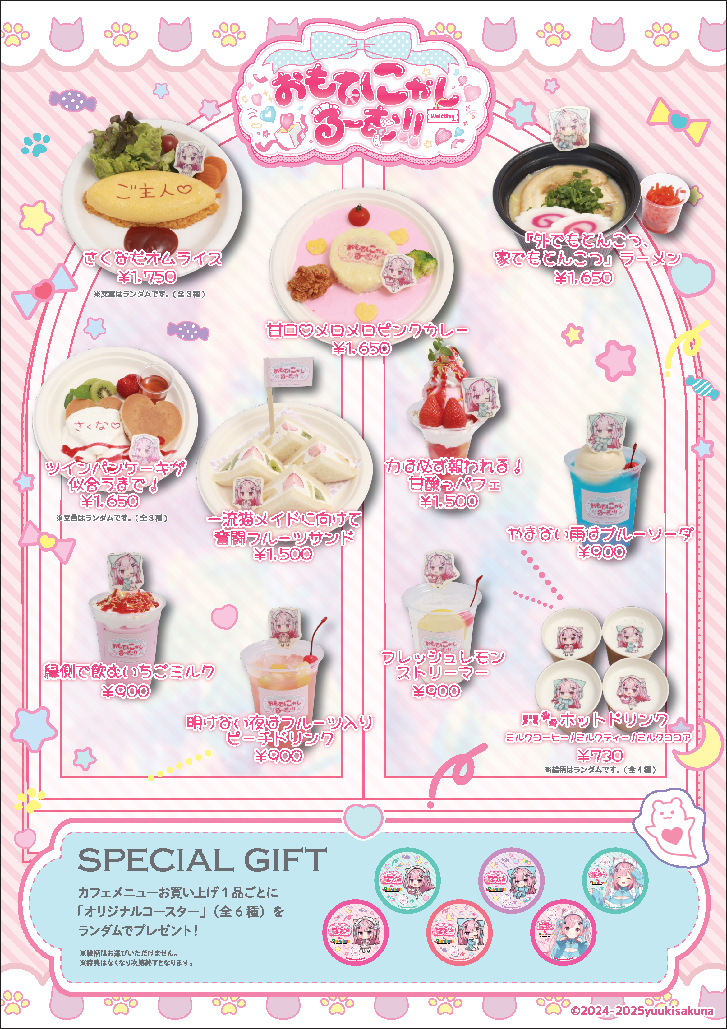 期間中、「結城さくな×おもてにゃしるーむ」カフェメニューをお買い上げ1品ごとに【オリジナルコースター(全6種)】をランダムで1枚差し上げます。