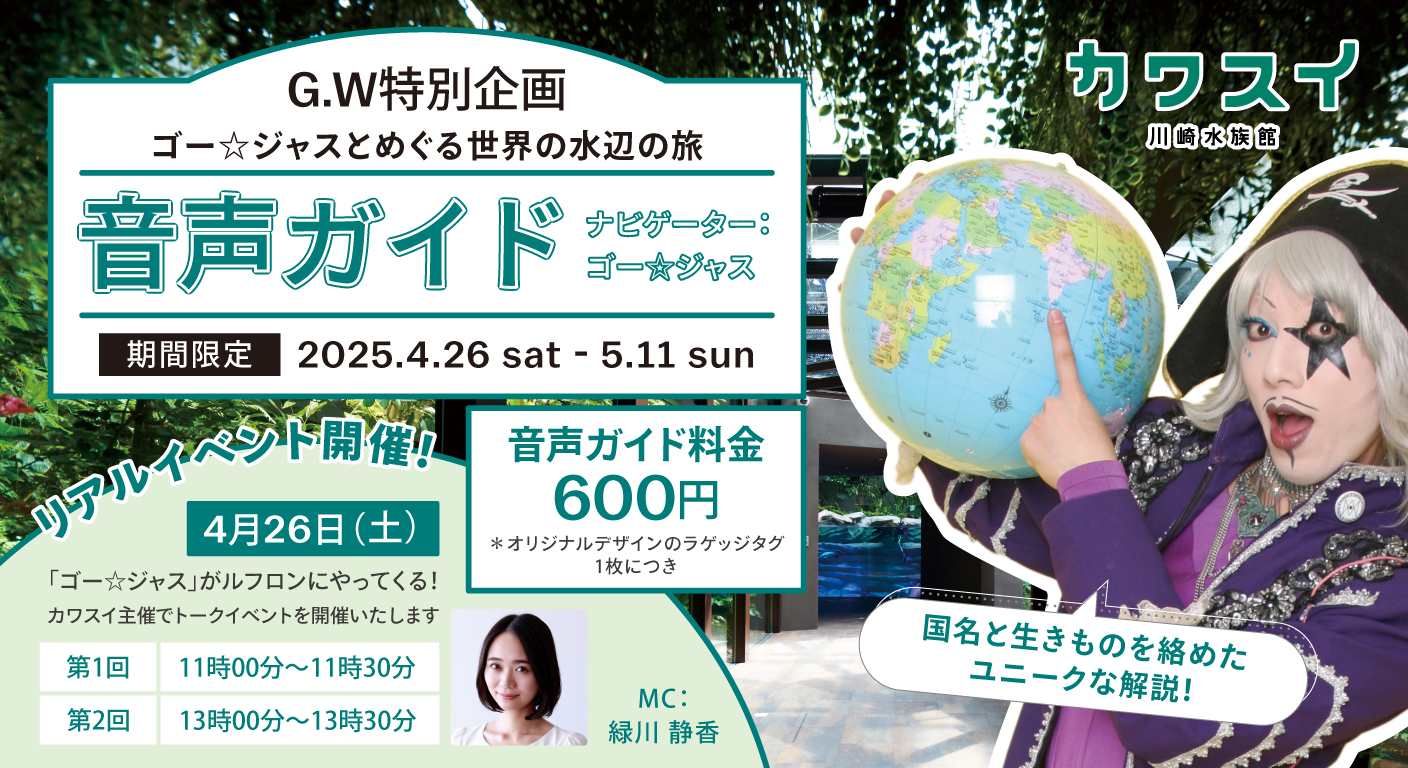 当日は、ゴー☆ジャスならではのユーモアあふれるトークで、カワスイの見どころや、音声ガイドにまつわる裏話、水族館の楽しみ方などをたっぷりご紹介。お子さまから大人まで楽しめる内容となっており、観覧無料・予約不要でどなたでもご参加いただけます。