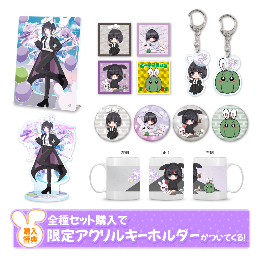 アクリルスタンド「スーツ」、アクリルパネル「スーツ」、アクリルキーホルダー「スーツ」、アクリルキーホルダー「ピーマンうさぎ」、ステッカー4種、缶バッジ4種、マグカップがセットになっています!
