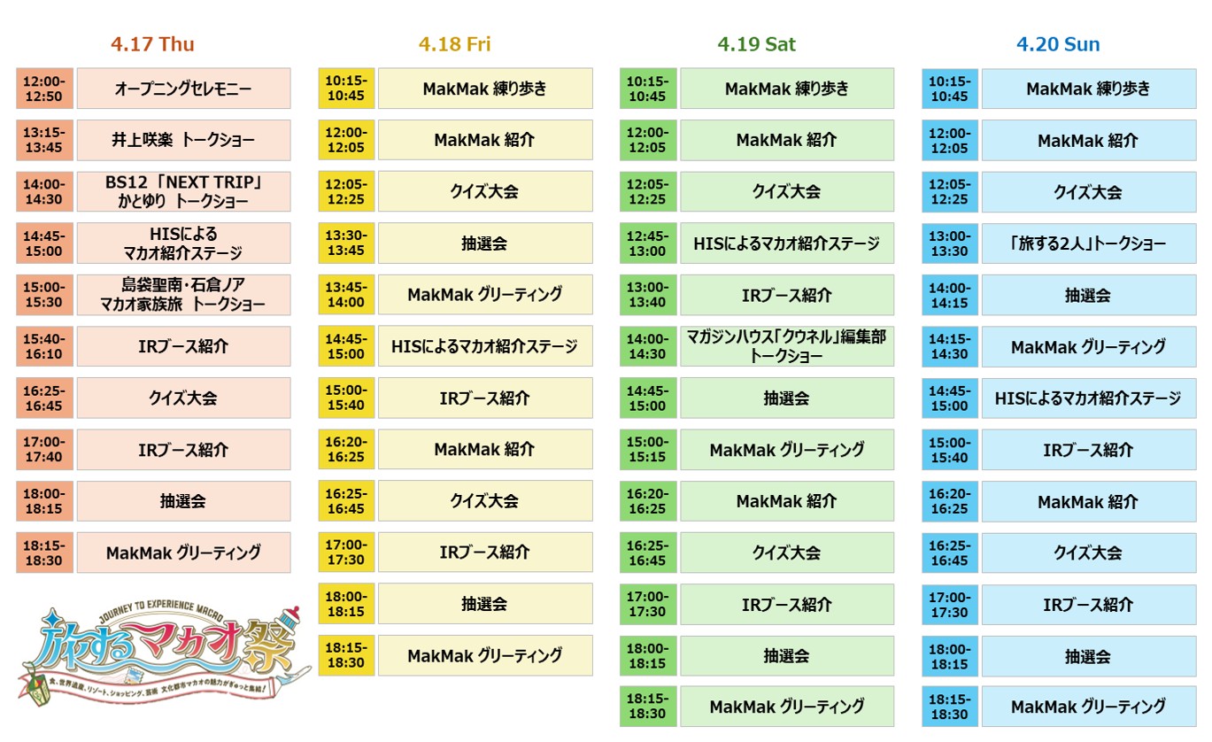 また、ホテル宿泊券や東京発着マカオ直行便航空券などの豪華賞品が当たる抽選会や、マカオに関連したグッズがもらえるクイズ大会などを含んだ詳細なステージスケジュールも決定しました。