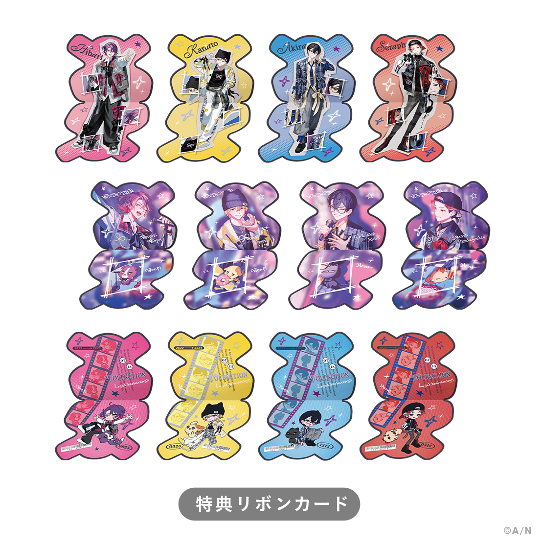にじさんじオフィシャルストアにて「VOLTACTION 3rd Anniversary 特典CP対象」のタグがついている商品を購入すると、お買い上げ3,000円(税込)ごとに 「リボンカード(全12種)」をランダムで1枚プレゼントいたします。