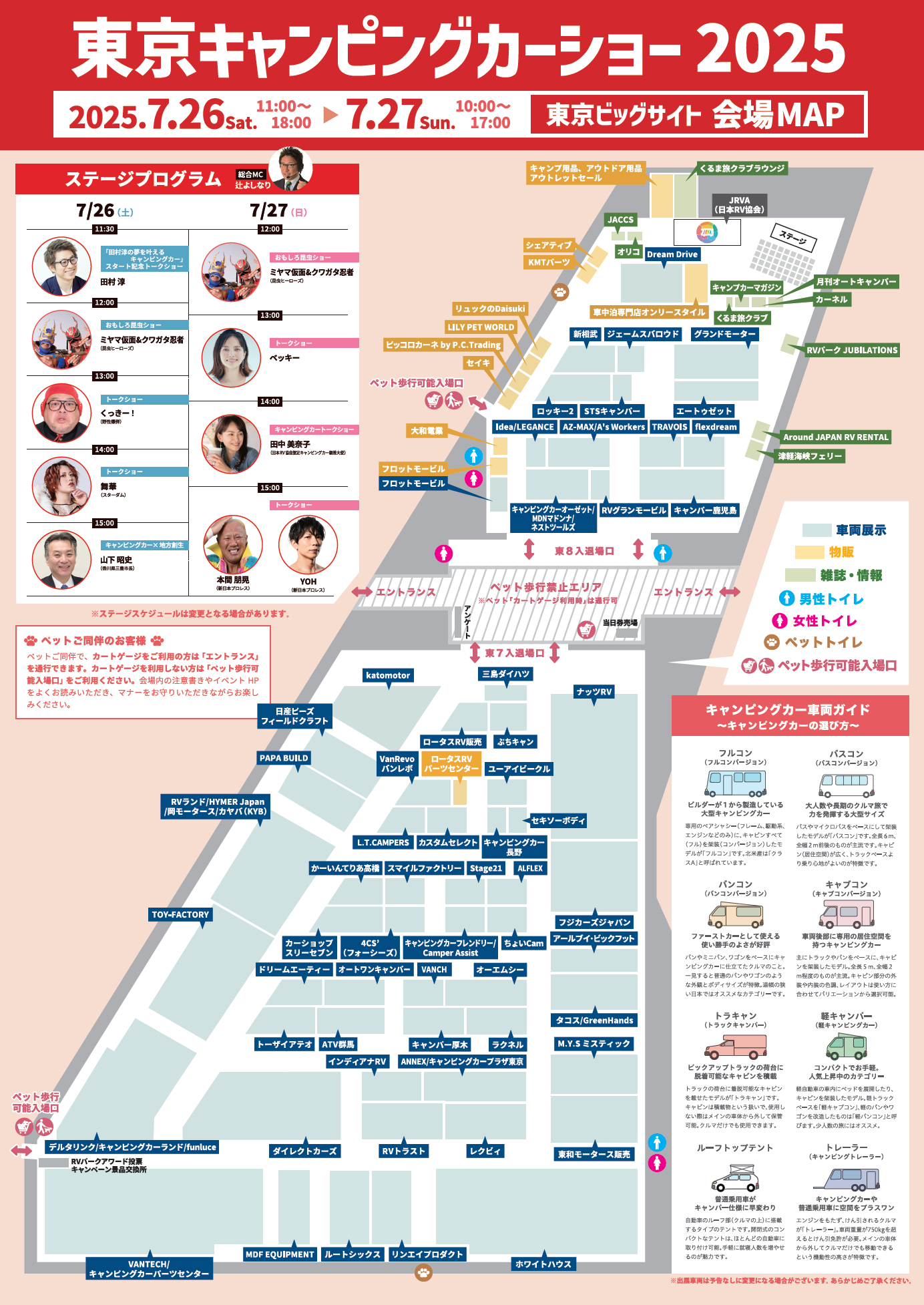 東京キャンピングカーショー2025の会場マップを公開しました。今回は全100社が出展、最新モデルから定番車種まで220台以上のキャンピングカーを一堂に展示します。