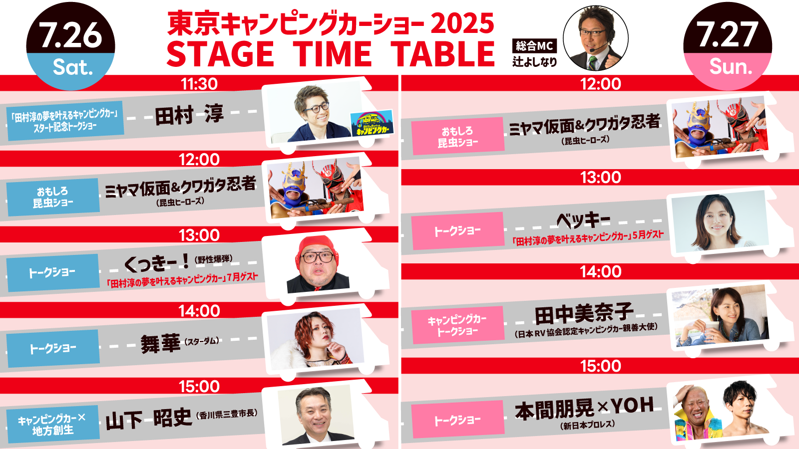 全ステージ登壇者が出揃ったステージはバラエティ豊かで子供から大人まで楽しめる豪華なステージになりました。キャンピングカーをたくさん見ながらステージイベントもお楽しみください!