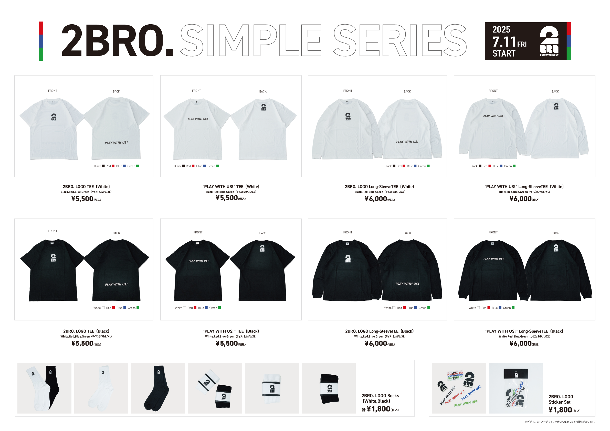 「SIMPLE SERIES」は、日常にも馴染むシンプルなデザインと、2BRO.らしさをさりげなく取り入れたアパレル&雑貨ライン。今回のラインナップでは、「PLAY WITH US!」をテーマに、TシャツやロングスリーブTシャツをはじめステッカーやソックス、全10アイテムをご用意。ファンのライフスタイルに自然に溶け込むデザインが特徴です。
