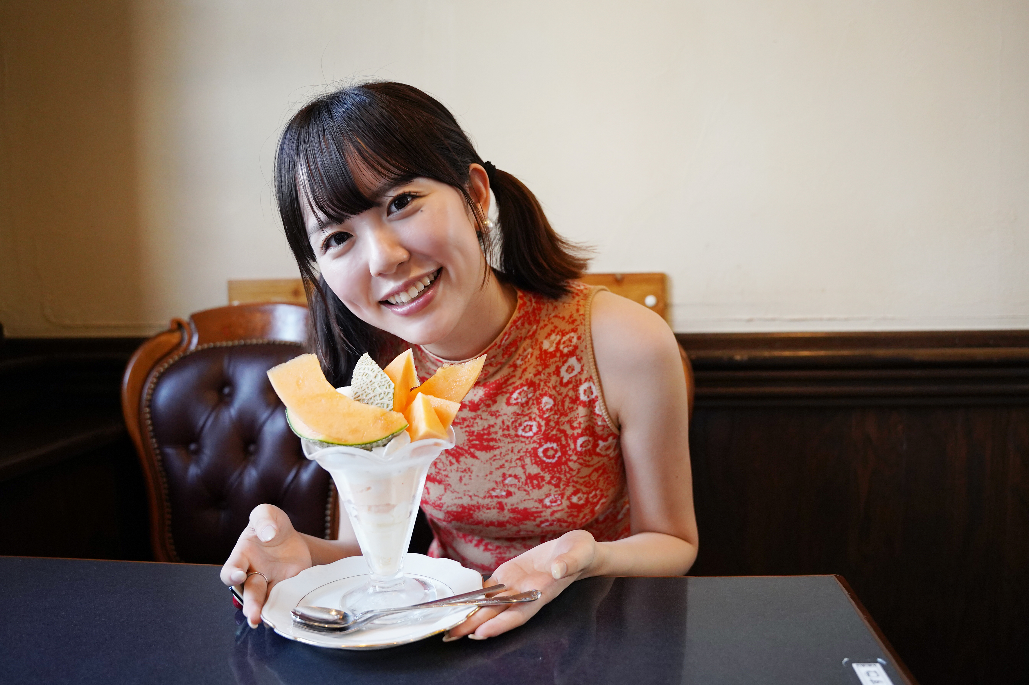 阪田さんが注文したのは、夏季限定の「らいでんメロンパフェ」。運ばれてきた瞬間、「これは逆写真詐欺すぎて驚きました!」とメニュー写真以上の迫力に思わず笑顔に。「かぶりついても一口で食べられないくらいの大きさで、食べ応えがありました」と話し、「メロンの甘さがしっかりしていて、いいものを選んでいるのがわかります」と、最後まで丁寧に味わっていました。
