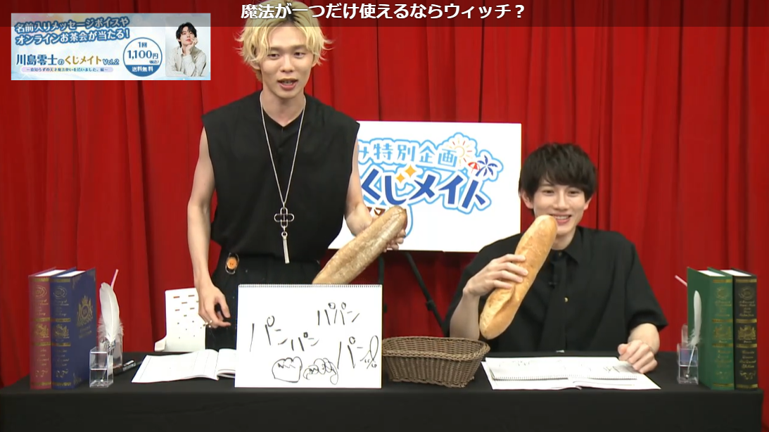 第1問は「魔法が1つだけ使えるなら、ウィッチ?」。赤澤が「推しに会える魔法」、対する川島は、「パンパンパパンパン」という謎の呪文をプレゼン。大量のパンの絵文字がコメント欄に溢れかえり、ついには机上のフランスパンを二人で食べ始めるという自由な展開に。視聴者投票の結果、赤澤の「推しに会える魔法」が圧勝しました。
